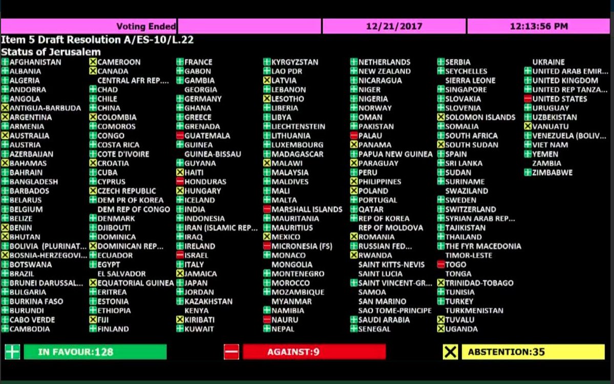 Final voting results on status of Jerusalem resolution at UN General Assembly: 128 - yes. 9 - no. Abstain - 35. **Also interesting that 21 countries did not vote at all including Ukraine, Georgia, El Salvador, Kenya, Moldova, Myanmar, Saint Lucia, Saint Kitts, CAR, DRC