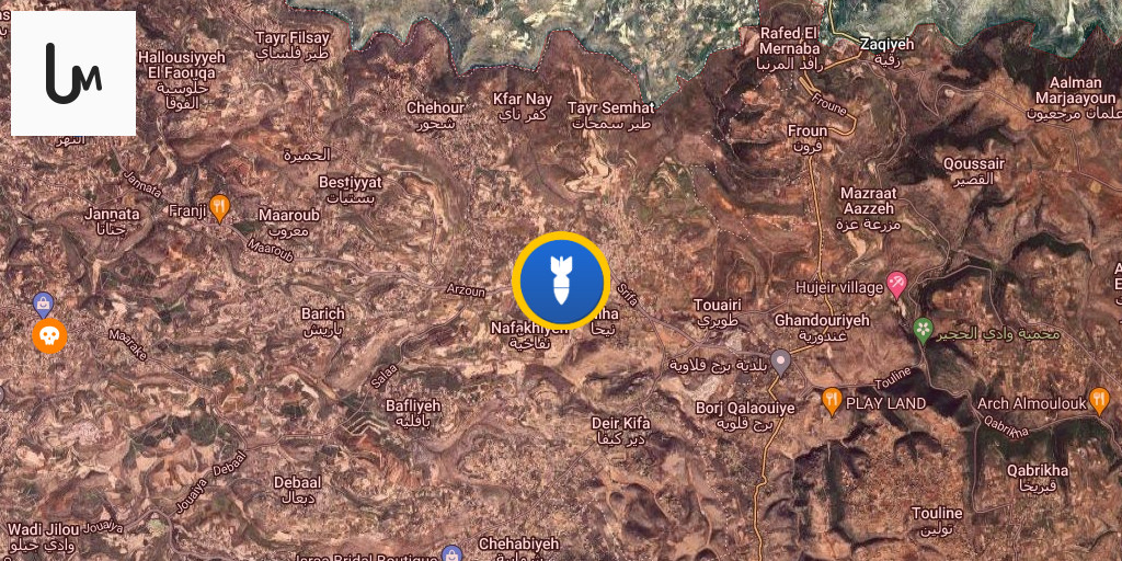 Artillery shells the outskirts of the towns of Rashaya al-Fakhar and Kafr Shuba, and the outskirts of the towns of Shama, Majdal Zoun, and Tyre Harfa in southern Lebanon.