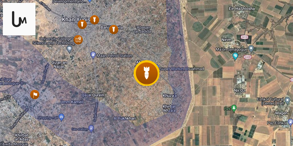 Airstrikes hit an agricultural room near the Ashkelon School in Abasan al-Kabira, east of Khan Yunis.