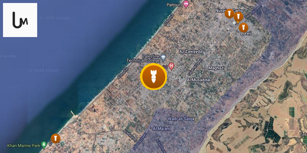Airstrikes target the vicinity of Al-Iman Mill, east of Mamdouh Saydam School, east of Al-Nuseirat Camp, central Gaza Strip.
