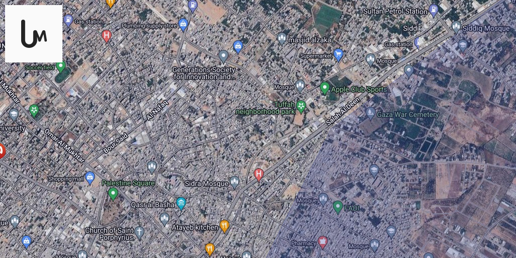 The Israeli army is carrying out a demolition operation targeting buildings behind the yellow line in the Shuja'iyya neighborhood, east of Gaza City.