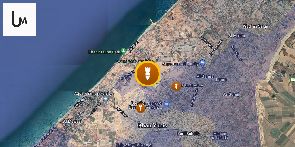 Aircraft launch a raid on Mawasi al-Qarara, northwest of Khan Yunis.