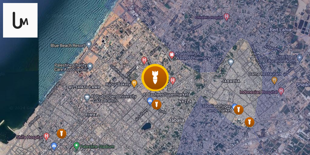 Airstrikes target the Civil Defense area west of Jabalia camp, north of the Gaza Strip.