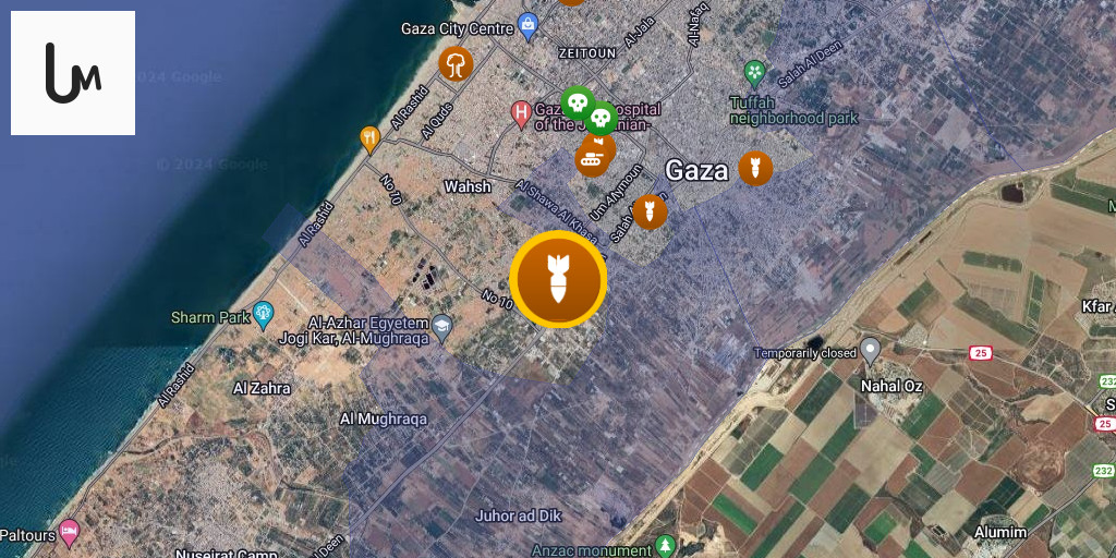 Aircraft launch a raid on the vicinity of Abu Sharkh roundabout, west of Jabalia camp, north of the Gaza Strip.