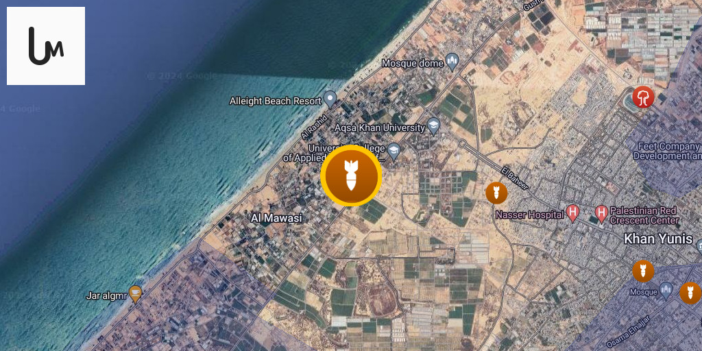 Massive destruction after an airstrike targeted a tent housing displaced people in Mawasi, west of Khan Yunis.