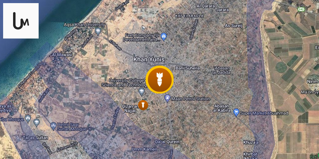 Injuries as a result of an airstrike on the vicinity of the College of Science and Technology, south of Khan Yunis, in the southern Gaza Strip.
