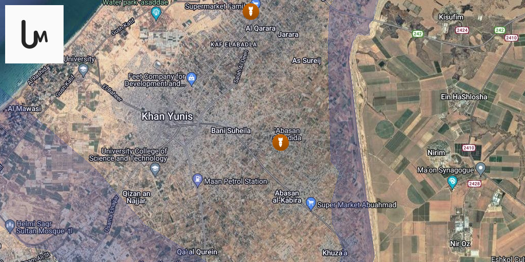 Israeli airstrikes target the vicinity of the European Hospital in the town of Al-Fakhari, east of Khan Yunis.