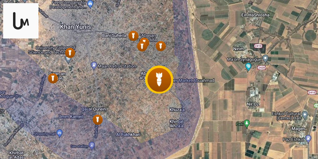 An Israeli air strike targeted a site behind the Ibad al-Rahman Mosque, west of Khan Yunis.