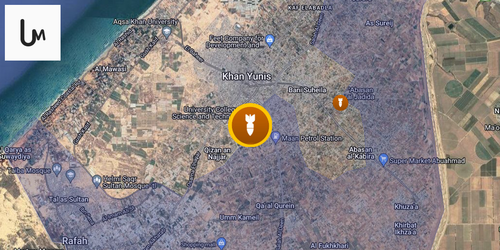 Israeli airstrike behind the yellow line east of Khan Younis city