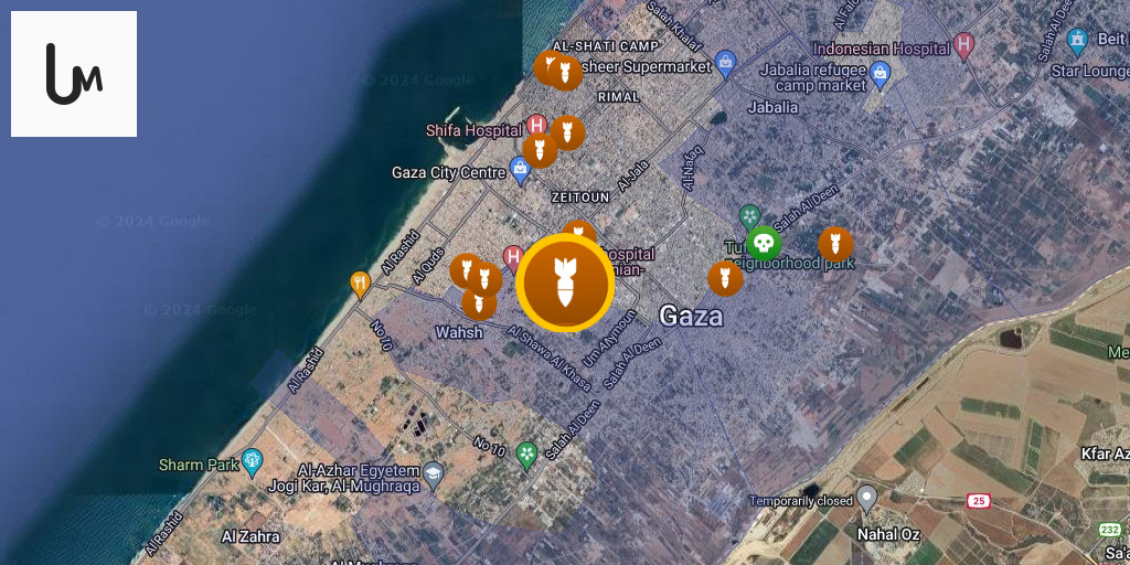 A picture of planes bombing a site near Al-Shifa Hospital.