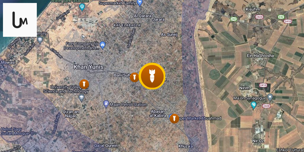 An airstrike targeted the home of the Abu Mustafa family near the Sharqiya Center in the town of Abasan al-Kabira, east of Khan Yunis, in the southern Gaza Strip.