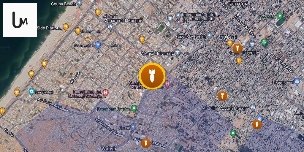 A picture of planes bombing a site near Al-Shifa Hospital.
