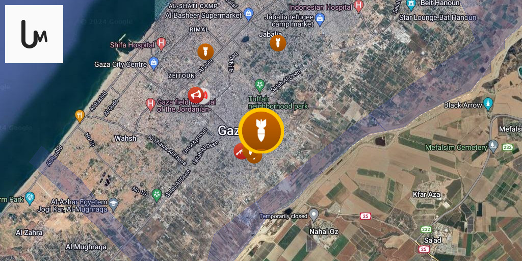 Violent Israeli shelling and airstrikes on the Shuja'iyya neighborhood, east of Gaza City.