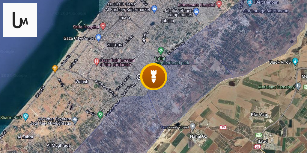 Israeli airstrikes beyond the yellow line in the Al-Tuffah neighborhood, east of Gaza City