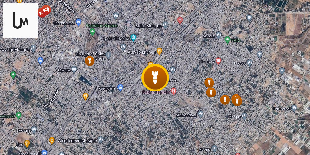 Airstrikes hit a building near Al-Zahraa School, east of Gaza City.