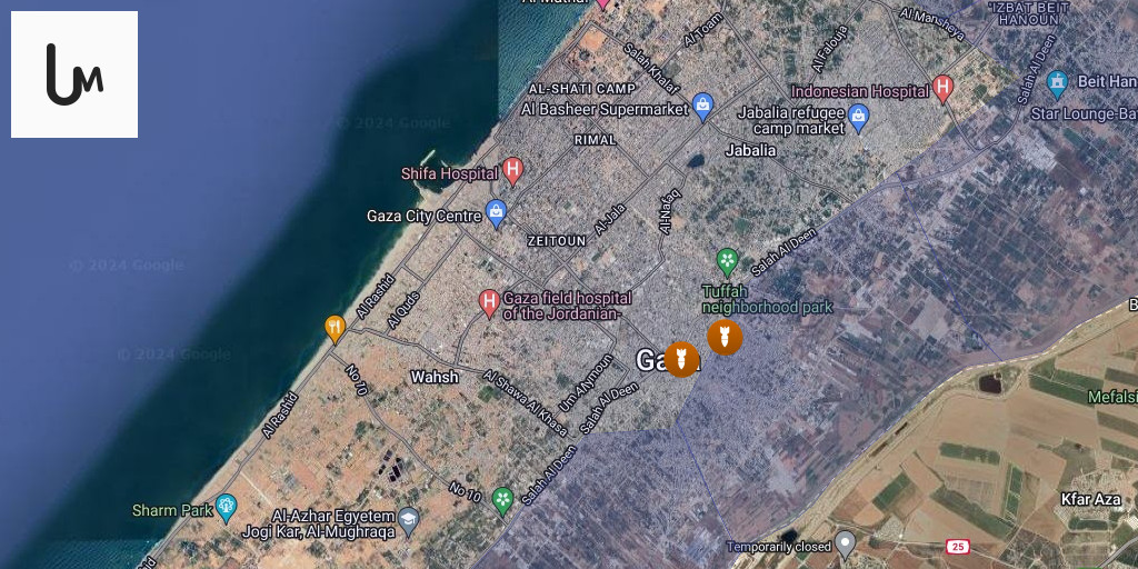 Israeli airstrikes inside the yellow line east of Khan Younis city in the southern Gaza Strip