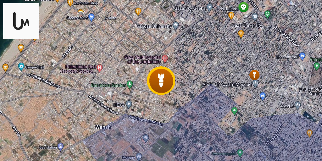 An Israeli airstrike in the vicinity of the Shuja'iyya bus station, east of Gaza City.