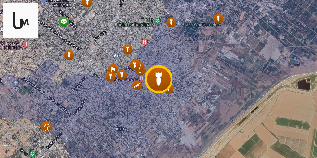 An Israeli airstrike in the vicinity of the Shuja'iyya bus station, east of Gaza City.