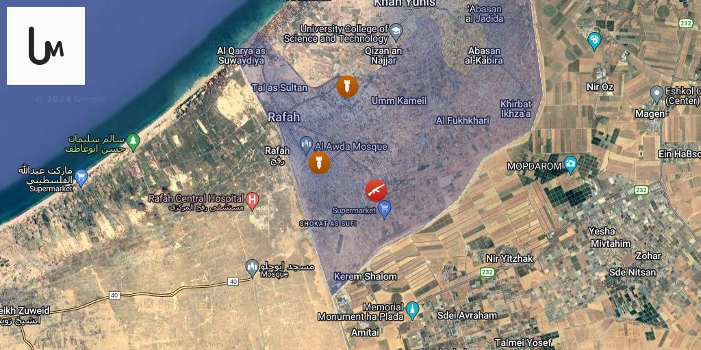 The army is launching airstrikes within its deployment areas behind the yellow line in the city of Rafah, in the southern Gaza Strip.
