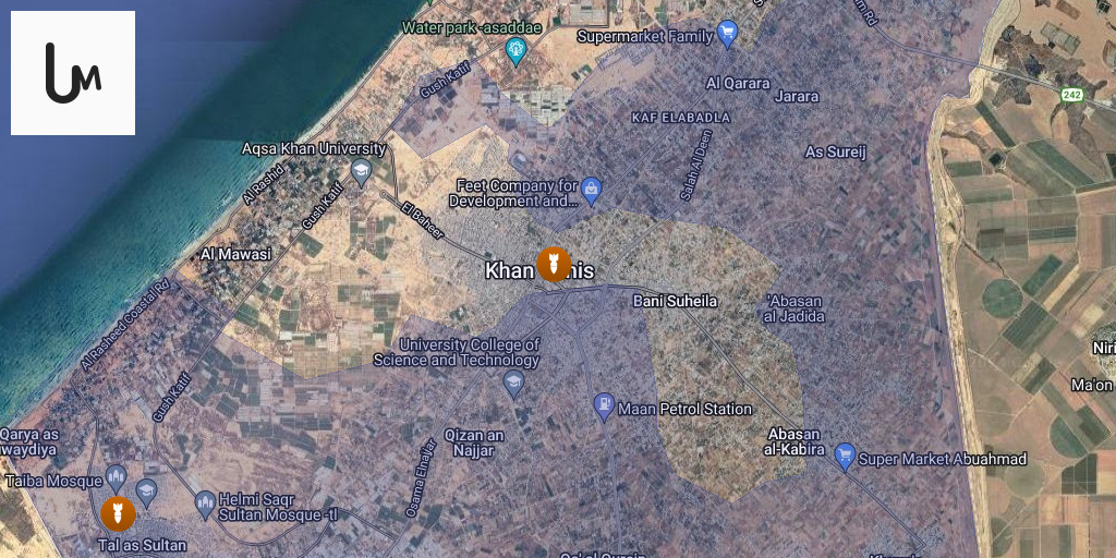 Israeli air strikes hit residential buildings in the center of Khan Yunis, south of the Gaza Strip.