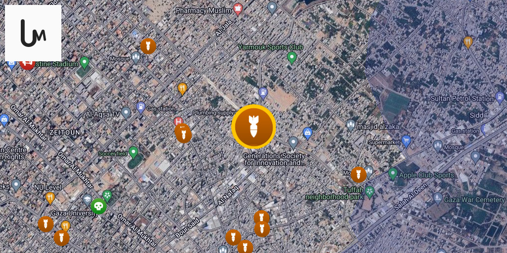 An Israeli airstrike in the vicinity of Al-Aqsa University in the Tal al-Hawa neighborhood, southwest of Gaza City.