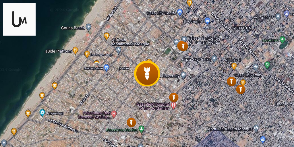 An Israeli airstrike in the vicinity of Al-Aqsa University in the Tal al-Hawa neighborhood, southwest of Gaza City.